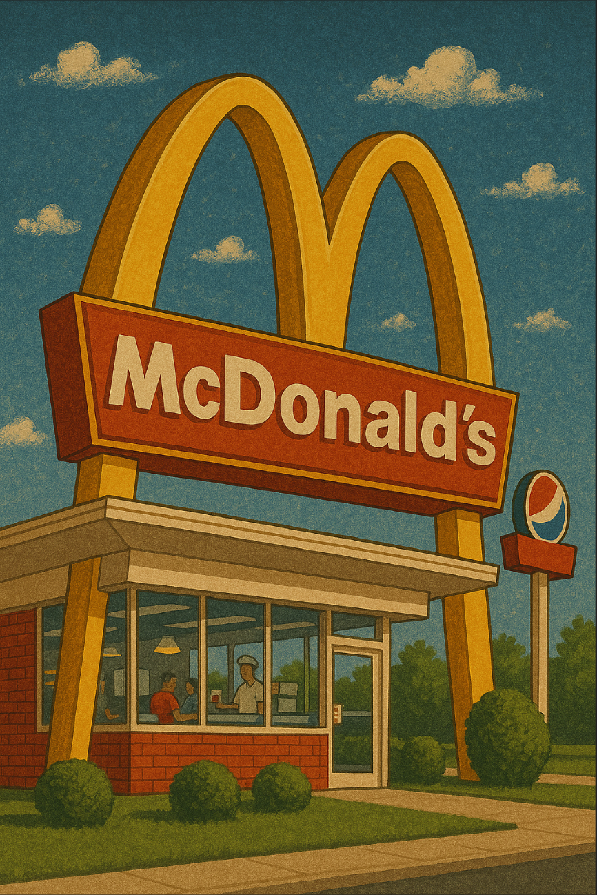 1930년대 미국 대공황을 겪은 리처드(Richard)와 모리스(Maurice) 맥도날드 형제는 영화관 운영 실패 후 음식 장사로 전환합니다. 1940년, 캘리포니아 샌버너디노에 드라이브인 스타일의 맥도날드 레스토랑을 열고, 1948년 ‘스피디 서비스 시스템(Speedee System)’이라는 혁신적인 패스트푸드 조리 시스템을 개발합니다.